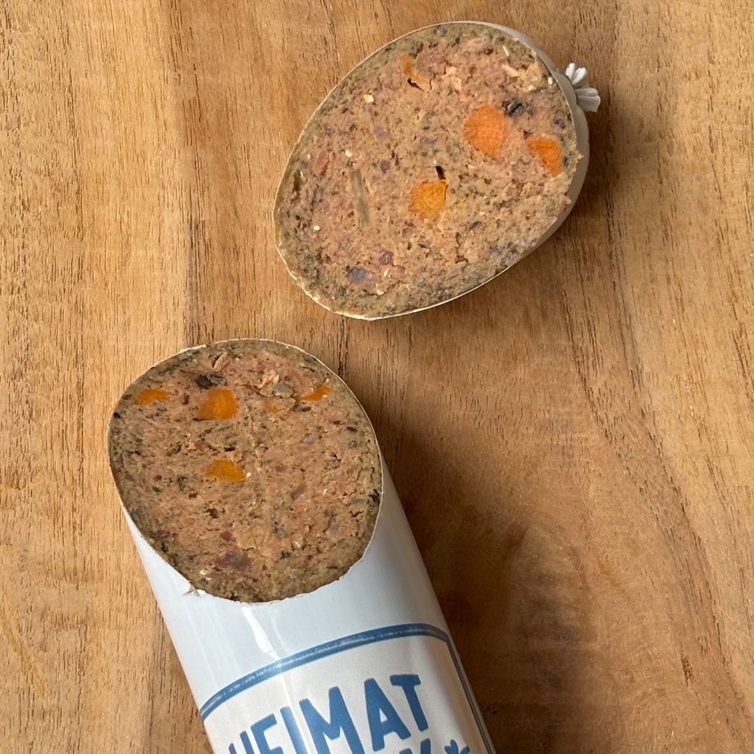 Für unsere Feuchtnahrung verwenden wir ausschließlich natürliche, regionale Rohstoffe – bestes Fleisch, frisches Gemüse, sonnengereiftes Obst und wertvolle Wiesenkräuter. Alles wird schonend verarbeitet, damit die wertvollen Nährstoffe erhalten bleiben und dein Hund das Beste aus der Natur bekommt.