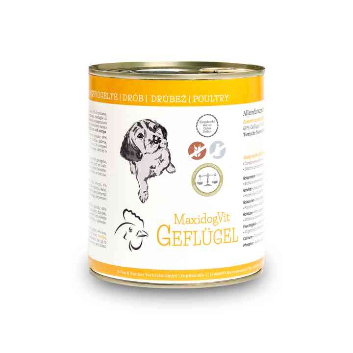 MaxidogVit Geflügel ist eine besonders leicht verdauliche Hundenahrung mit feinem Geflügelfleisch als Hauptzutat – ideal für ernährungssensible oder ältere Hunde. Das magere Fleisch liefert hochwertige Proteine und unterstützt eine gesunde Muskulatur sowie das allgemeine Wohlbefinden. Abgerundet wird die Mahlzeit durch schonend gegartes Gemüse wie Reis und Karotten sowie eine vitalstoffreiche Algenmischung, die das natürliche mineralische Gleichgewicht im Körper fördert. Eine ausgewogene, schmackhafte Vollnahrung für jeden Tag.
