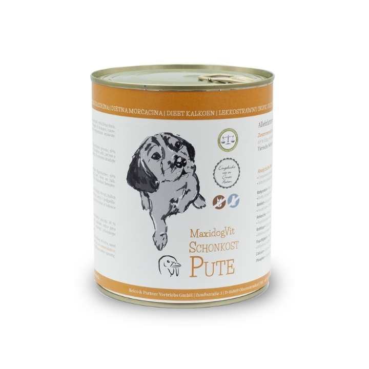 MaxidogVit Schonkost Pute ist eine besonders leicht verdauliche, bekömmliche Vollnahrung für Hunde mit sensiblem Magen-Darm-Trakt, Allergien oder nach Erkrankungen. Die Hauptzutat ist zartes Putenfleisch – fettarm, eiweißreich und gut verträglich. In Kombination mit schonend gegartem Gemüse wie Kartoffeln und Karotten sowie einer speziell abgestimmten Algenmischung sorgt dieses Menü für ein ausgewogenes Nährstoffprofil und ein stabiles mineralisches Gleichgewicht.
